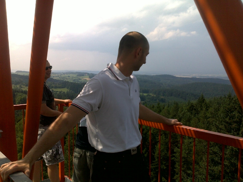Po nafocení několika snímků jsme se vydali přímo na rozhlednu. Rozhledna je postavena z ocelové příhradové konstrukce a její primární účel je sloužit jako vysílač pro mobilní operátory. Byla otevřena v roce 2008, je volně a zdarma přístupná. Leží v nadmořské výšce 664 metrů a vede na ni 147 točitých schodů. Z jejího vrcholu lze spatřit Strakonice a okolí, Šumavu i Brdy. Následovaly další vrcholové fotky.
